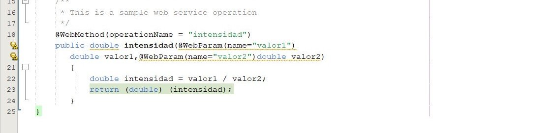 En esta imagen se observa la implementación de un Web Service en Java, usando anotaciones de Jakarta EE. Se define una operación llamada intensidad, que simula el cálculo de la intensidad eléctrica utilizando la Ley de Ohm (I = V / R), donde: